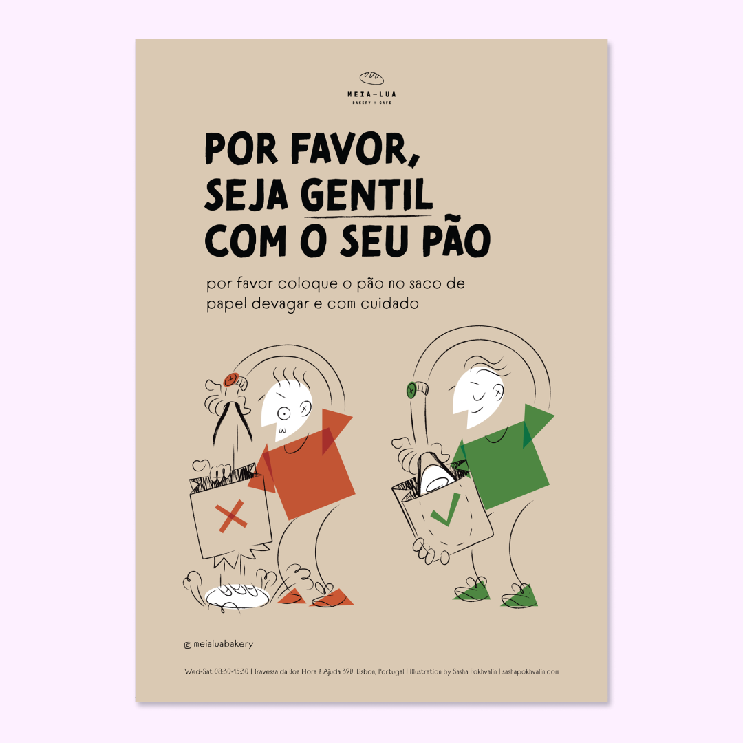 I was approached by Meia Lua Bakery (Lisbon, Portugal) to create a poster with bread handling instructions. It was meant to be informative yet fun. To fit the look of the cafe and the rest of artwork on the walls, I've created a poster inspired by old UPA cartoons with expressive shapes, funny characters and bold colours.